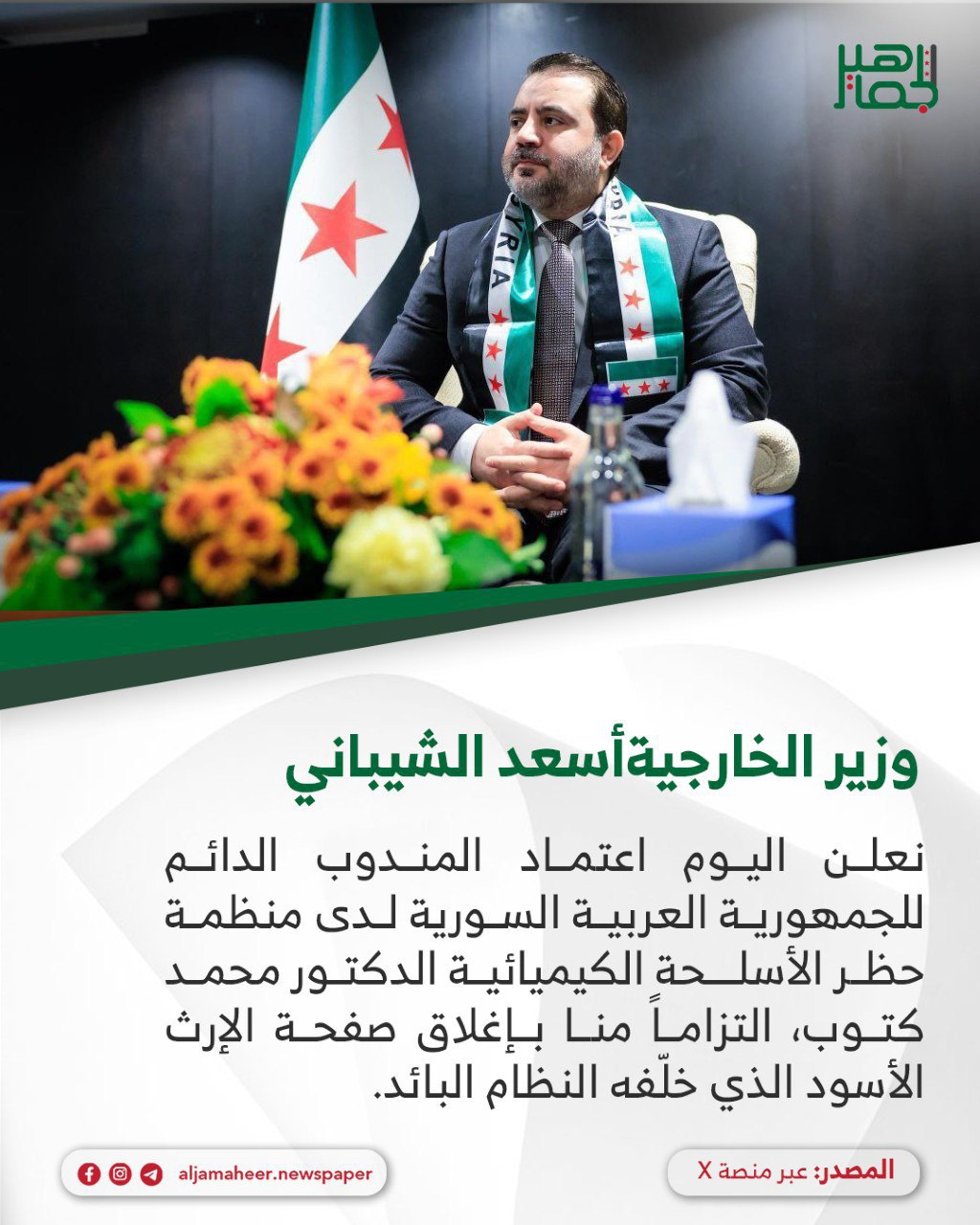 📌نعلن اليوم اعتماد المندوب الدائم للجمهورية العربية السورية لدى منظمة حظر الأسلـ ـحة الكيمـ ـيائية الدكتور محمد كتوب، التزاماً منا بإغلاق صفحة الإرث الأسود الذي خلّفه النظام البائد.