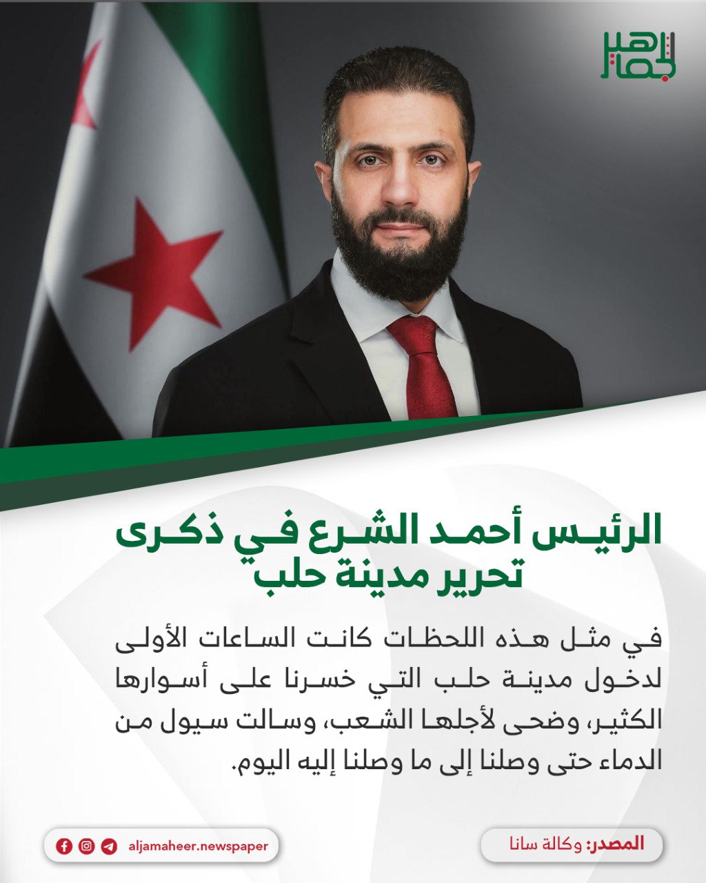 📌يا شعب حلب نحن لن نكتفي فقط بتحرير حلب، بل المشوار قد بدأ بالفعل منذ اللحظة الأولى لتحريرها، وسنعمل جميعاً بكل جهد لبناء سوريا من جديد.
