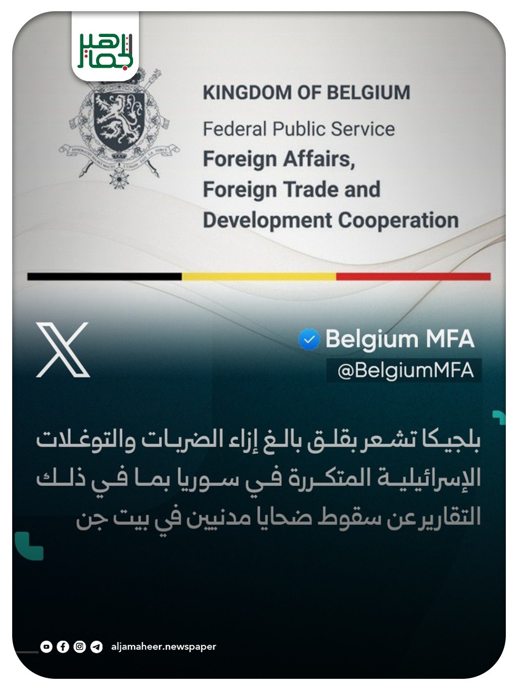 📌 بلجيكا تشعر بقلق بالغ إزاء الضربات والتوغلات الإسرائيـ ـلية المتكررة في سورية بما في ذلك التقارير عن سقوط ضـ ـحايا مدنيين في بيت جن