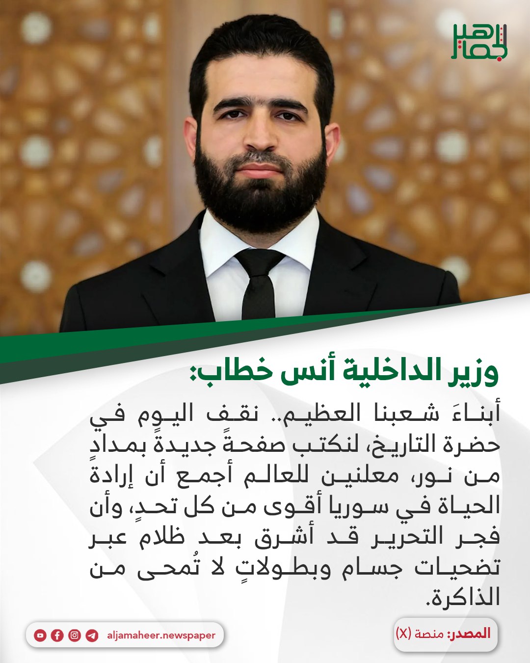 أبناءَ شعبنا العظيم.. نقف اليوم في حضرة التاريخ، لنكتب صفحةً جديدةً بمدادٍ من نور، معلنين للعالم أجمع أن إرادة الحياة في سورية أقوى من كل تحدٍ، وأن فجر التحرير قد أشرق بعد ظلام عبر تضحيات جسام وبطولاتٍ لا تُمحى من الذاكرة.