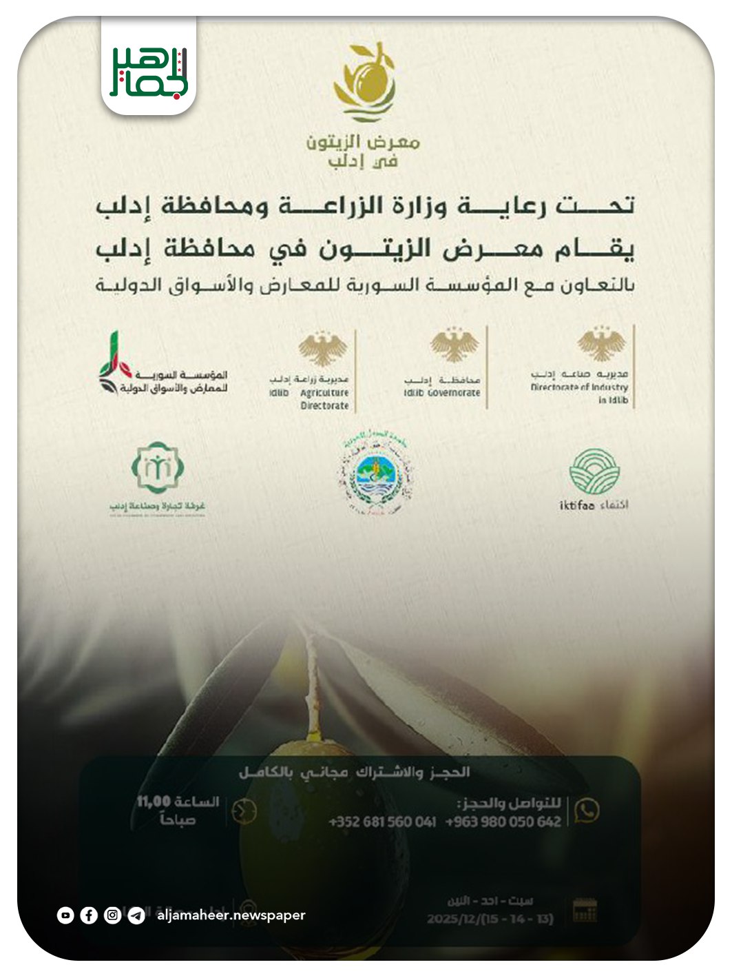 برعاية وزارة الزراعة ومحافظة إدلب، يقام في محافظة إدلب معرض الزيتون2026 بتنظيم مشترك مع المؤسسة السورية للمعارض والأسواق الدولية
