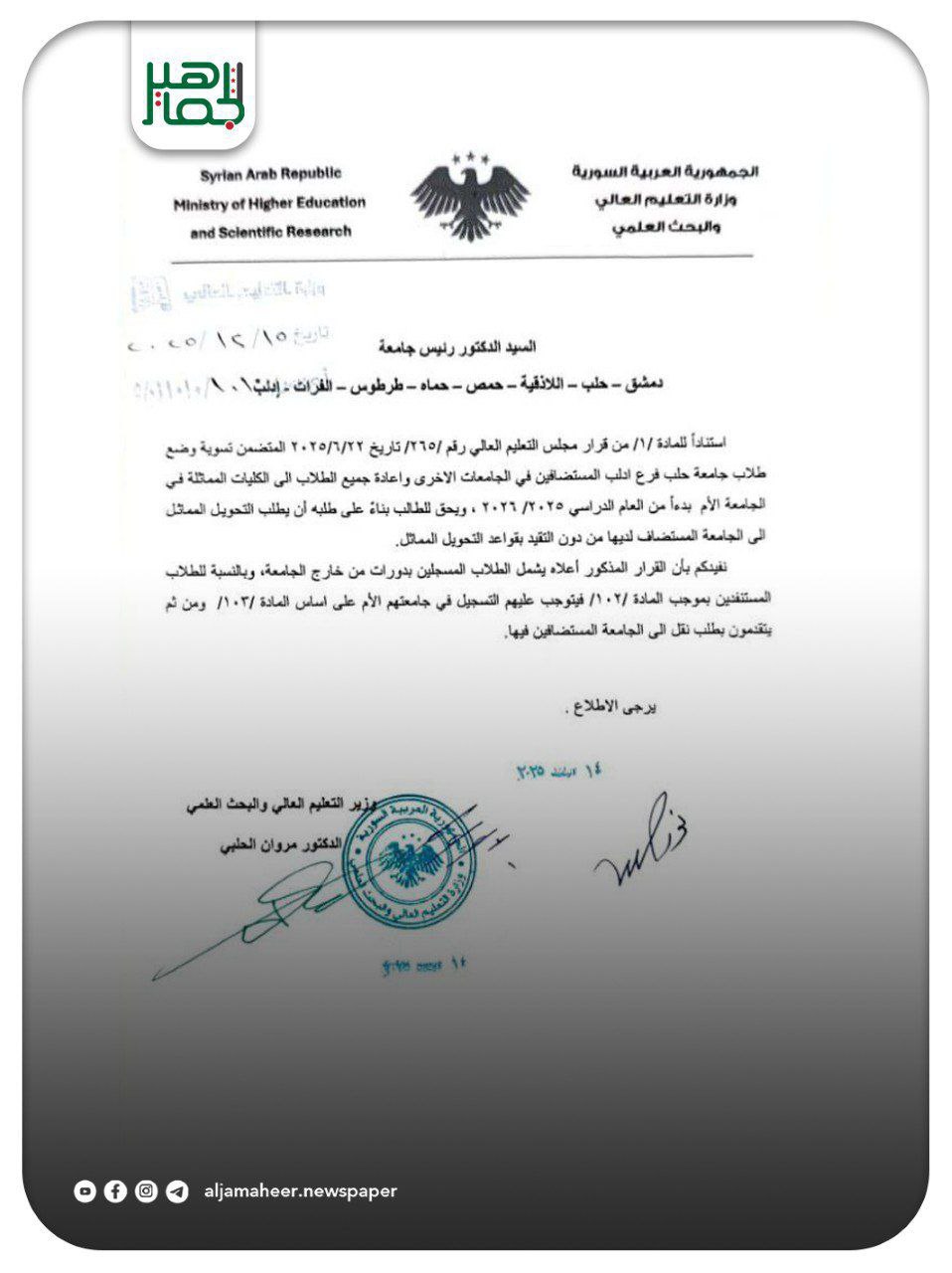وزارة التعليم العالي: تسوية وضع طلاب جامعة حلب فرع إدلب المستضافين في الجامعات الأخرى وإعادة جميع الطلاب إلى الكليات المماثلة في الجامعة الأم بدءاً من العام الدراسي 2025/2026 وفق التعميم المرفق شباب وجامعات On ديسمبر 15, 2025 Share Share FacebookTwitterGoogle+ReddItWhatsAppPinterestالبريد الإلكتروني