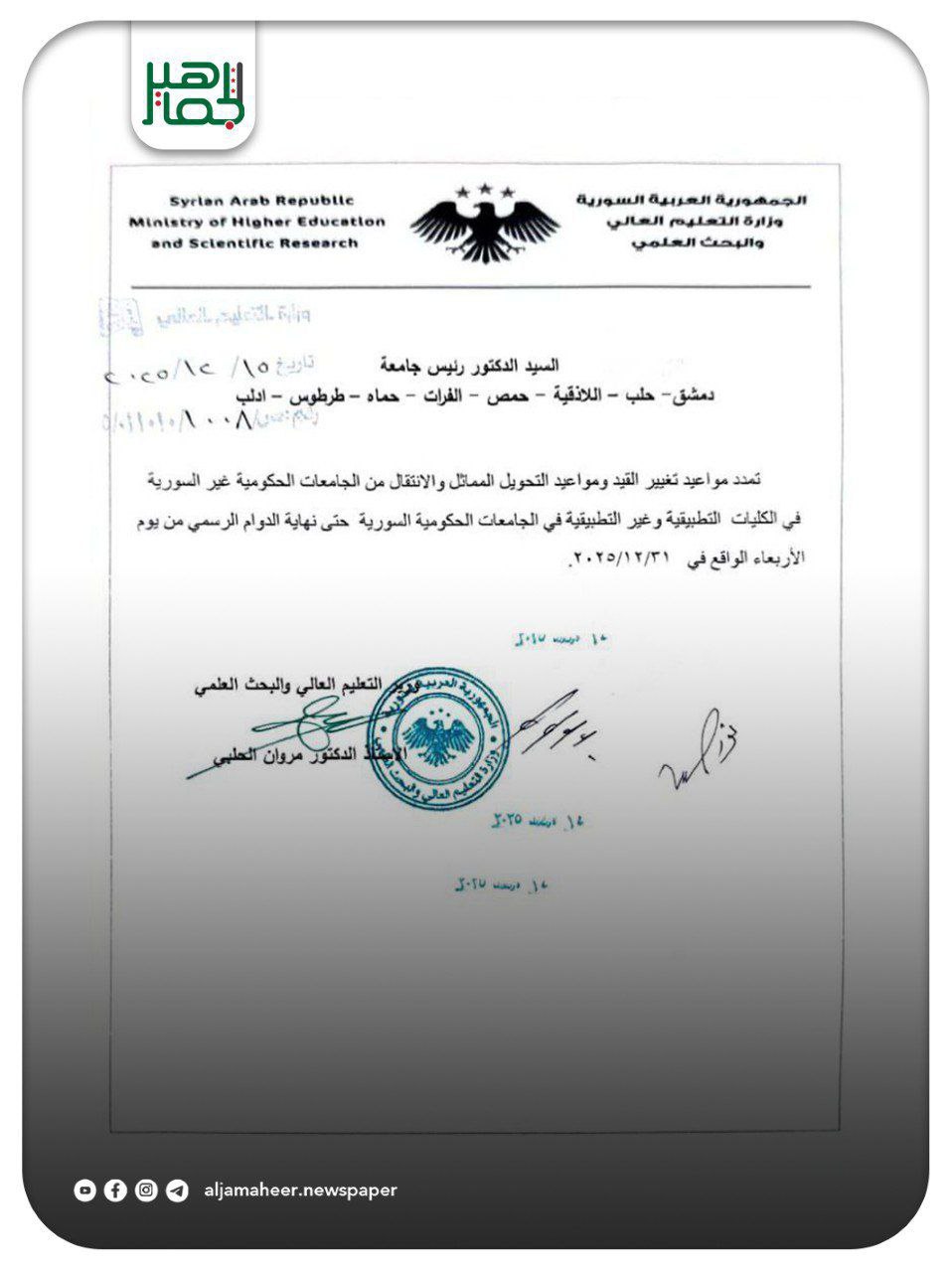 وزارة التعليم العالي: تمديد مواعيد تغيير القيد ومواعيد التحويل المماثل والانتقال من الجامعات الحكومية غير السورية في الكليات التطبيقية وغير التطبيقية في الجامعات الحكومية السورية حتى نهاية الدوام الرسمي من يوم الأربعاء الواقع في 31/12/2025 شباب وجامعات On ديسمبر 15, 2025 Share Share FacebookTwitterGoogle+ReddItWhatsAppPinterestالبريد الإلكتروني
