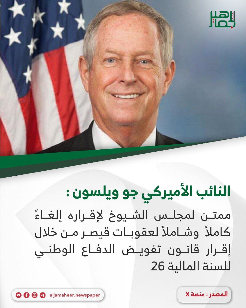 النائب الأميركي جو ويلسون عبر منصة “X”: أحدث الأخبار On ديسمبر 17, 2025 Share ممتن لمجلس الشيوخ لإقراره إلغاءً كاملاً وشاملاً لعقوبات قيصر من خلال إقرار قانون تفويض الدفاع الوطني للسنة المالية 26. من المتوقع أن يوقع الرئيس ترامب في غضون أيام، لنجعل سورية عظيمة مرة أخرى اشترك بقناة التيليجرام: https://t.me/jamaheer Share FacebookTwitterGoogle+ReddItWhatsAppPinterestالبريد الإلكتروني