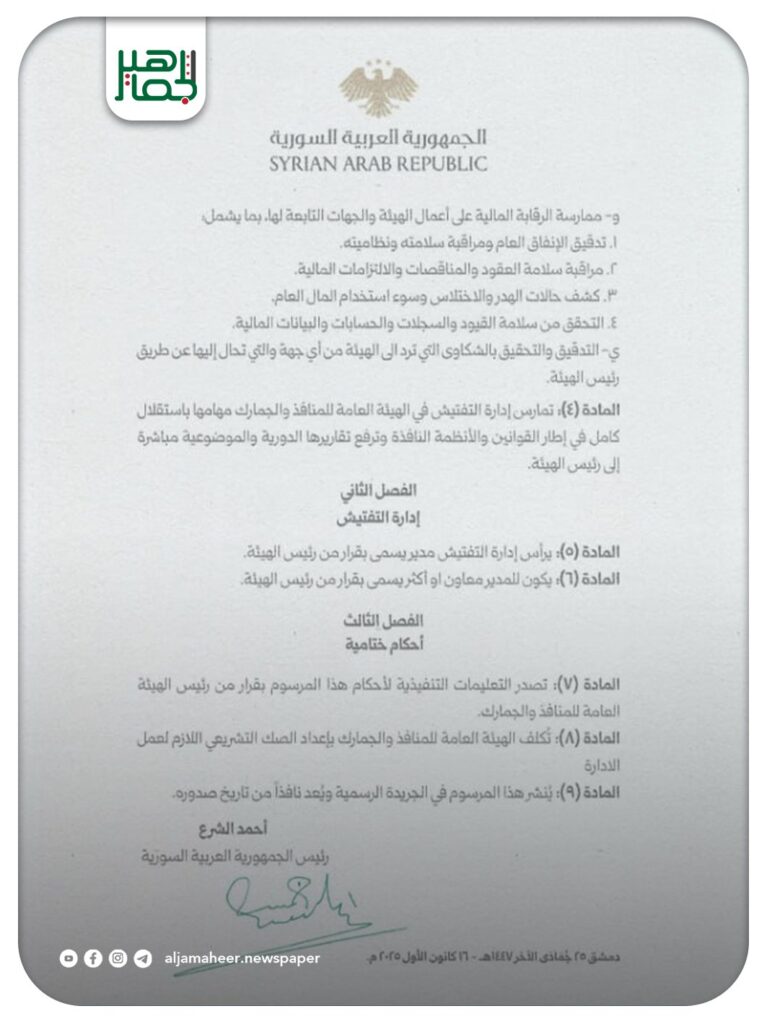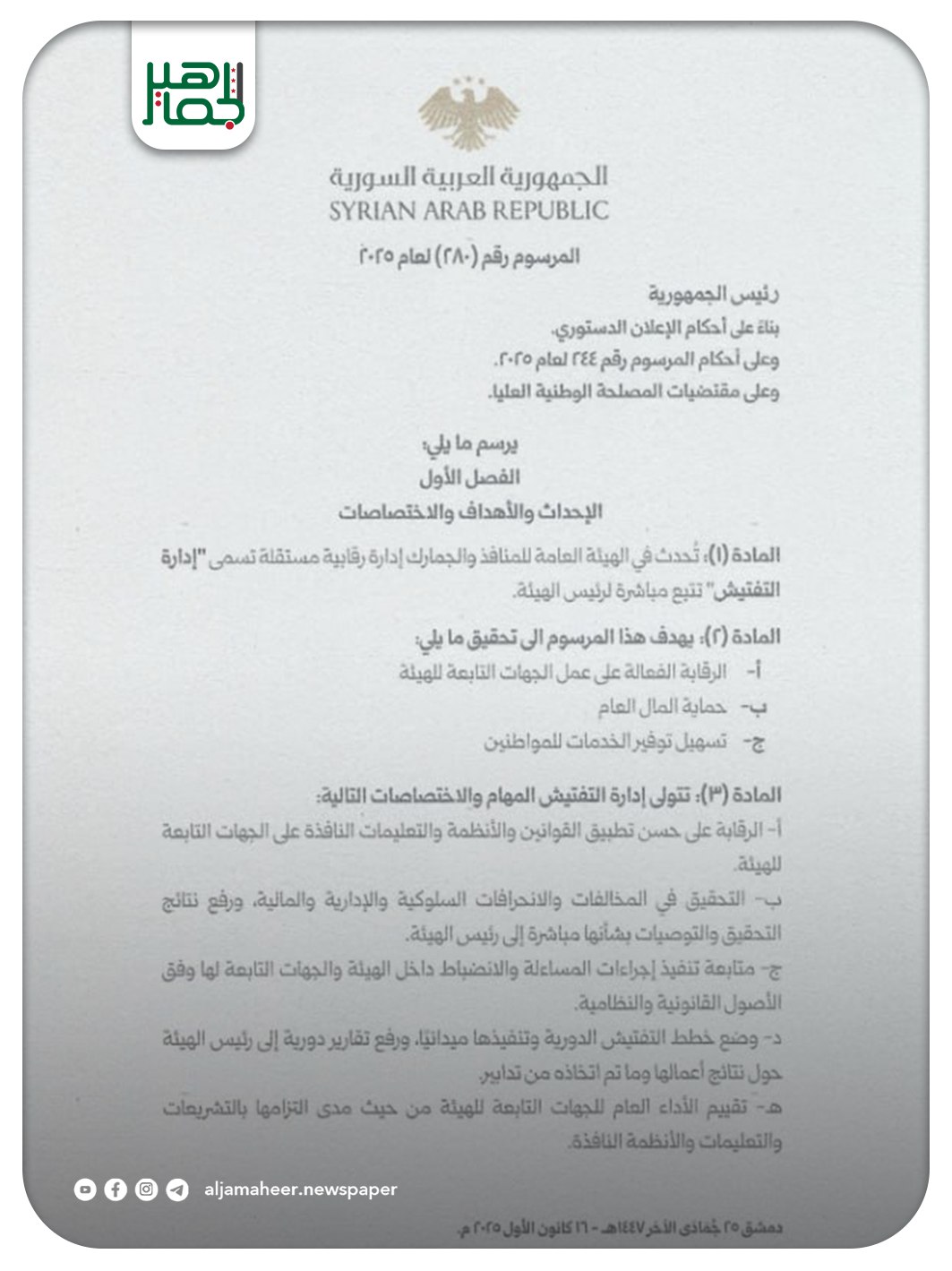 السيد الرئيس أحمد الشرع يصدر مرسوماً يقضي بإحداث إدارة رقابية مستقلة في الهيئة العامة للمنافذ والجمارك تسمى “إدارة التفتيش” تتبع مباشرةً لرئيس الهيئة أحدث الأخبار On ديسمبر 18, 2025 Share Share FacebookTwitterGoogle+ReddItWhatsAppPinterestالبريد الإلكتروني