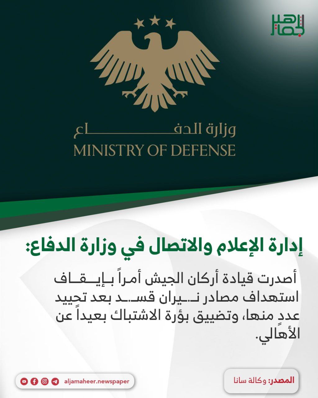 أصدرت قيادة أركان الجيش أمراً بإيقاف استهداف مصادر نيــ.ــران قــ.ــسد بعد تحييد عددٍ منها، وتضييق بؤرة الاشتــ.ــباك بعيداً عن الأهالي.