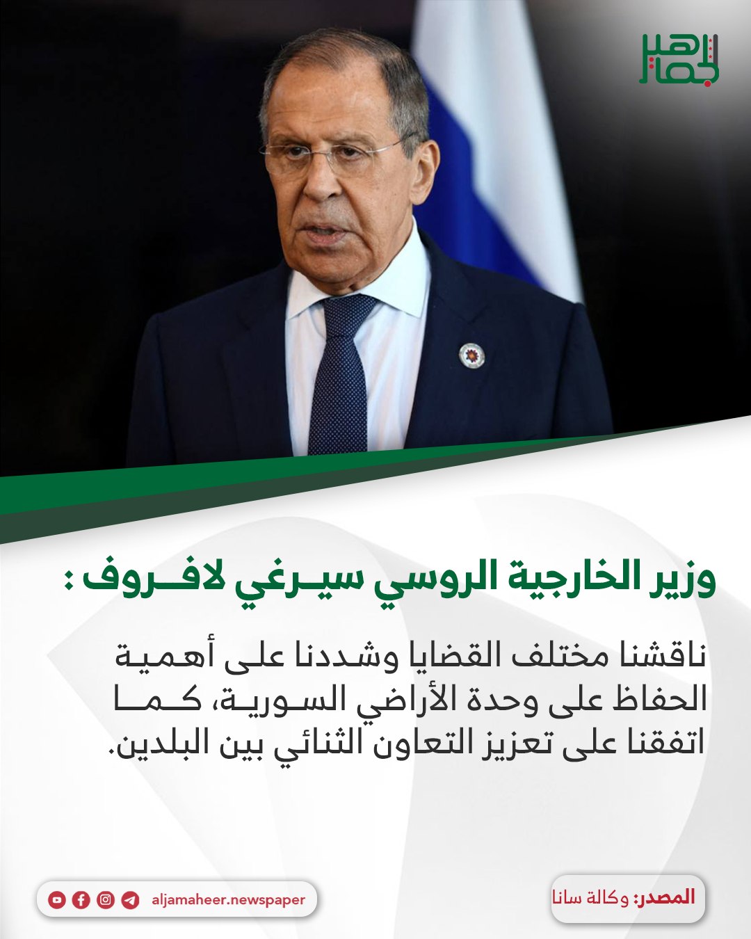 وزير الخارجية الروسي سيرغي لافروف أحدث الأخبارسياسة On ديسمبر 24, 2025 Share ناقشنا مختلف القضايا وشددنا على أهمية الحفاظ على وحدة الأراضي السورية، كما اتفقنا على تعزيز التعاون الثنائي بين البلدين. Share FacebookTwitterGoogle+ReddItWhatsAppPinterestالبريد الإلكتروني