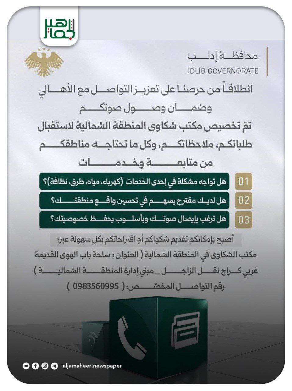 أعلنت محافظة إدلب عن تفعيل مكتب شكاوى المنطقة الشمالية لتعزيز التواصل مع الأهالي وضمان وصول الملاحظات والشكاوى والمتابعة الخدمية، والتواصل عبر الرقم الظاهر بالصورة خدمي On ديسمبر 25, 2025 Share 🔔 اشترك بقناة التيليجرام: https://t.me/jamaheer Share FacebookTwitterGoogle+ReddItWhatsAppPinterestالبريد الإلكتروني