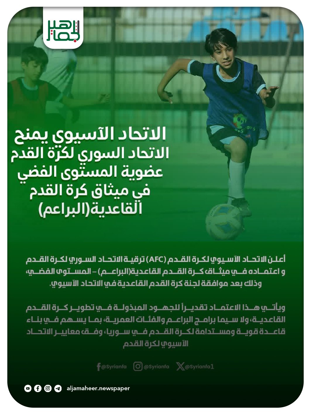 📌 يأتي هذا الاعتماد تقديراً للجهود المبذولة في تطوير كرة القدم القاعدية، ولا سيما برامج البراعم والفئات العمرية، بما يسهم في بناء قاعدة قوية ومستدامة لكرة القدم في سوريا، وفق معايير الاتحاد الآسيوي لكرة القدم.