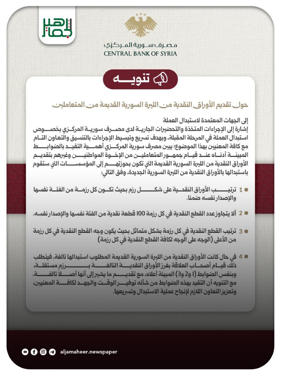 مصرف سورية المركزي يصدر تعليمات حول طريقة تقديم الأوراق النقدية من الليرة السورية القديمة من المتعاملين إلى المصرف. اقتصاد On ديسمبر 28, 2025 Share Share FacebookTwitterGoogle+ReddItWhatsAppPinterestالبريد الإلكتروني