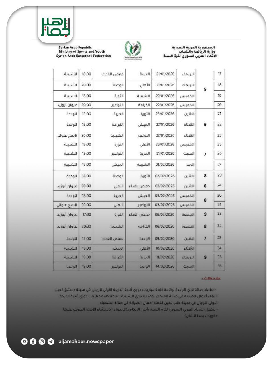 جدول مباريات مرحلة ذهاب دوري سلة الرجال السوري الذي تنطلق منافساته بتاريخ 5 كانون الثاني من العام المقبل 2026 رياضة On ديسمبر 28, 2025 Share Share FacebookTwitterGoogle+ReddItWhatsAppPinterestالبريد الإلكتروني