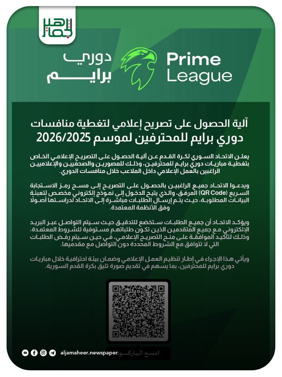 الاتحاد العربي السوري لكرة القدم يعلن عن آلية الحصول على تصريح إعلامي خاص بتغطية مباريات “دوري برايم للمحترفين” للوصول الى الرابط الموجود في الـQR رياضة Last updated ديسمبر 29, 2025 Share Share FacebookTwitterGoogle+ReddItWhatsAppPinterestالبريد الإلكتروني