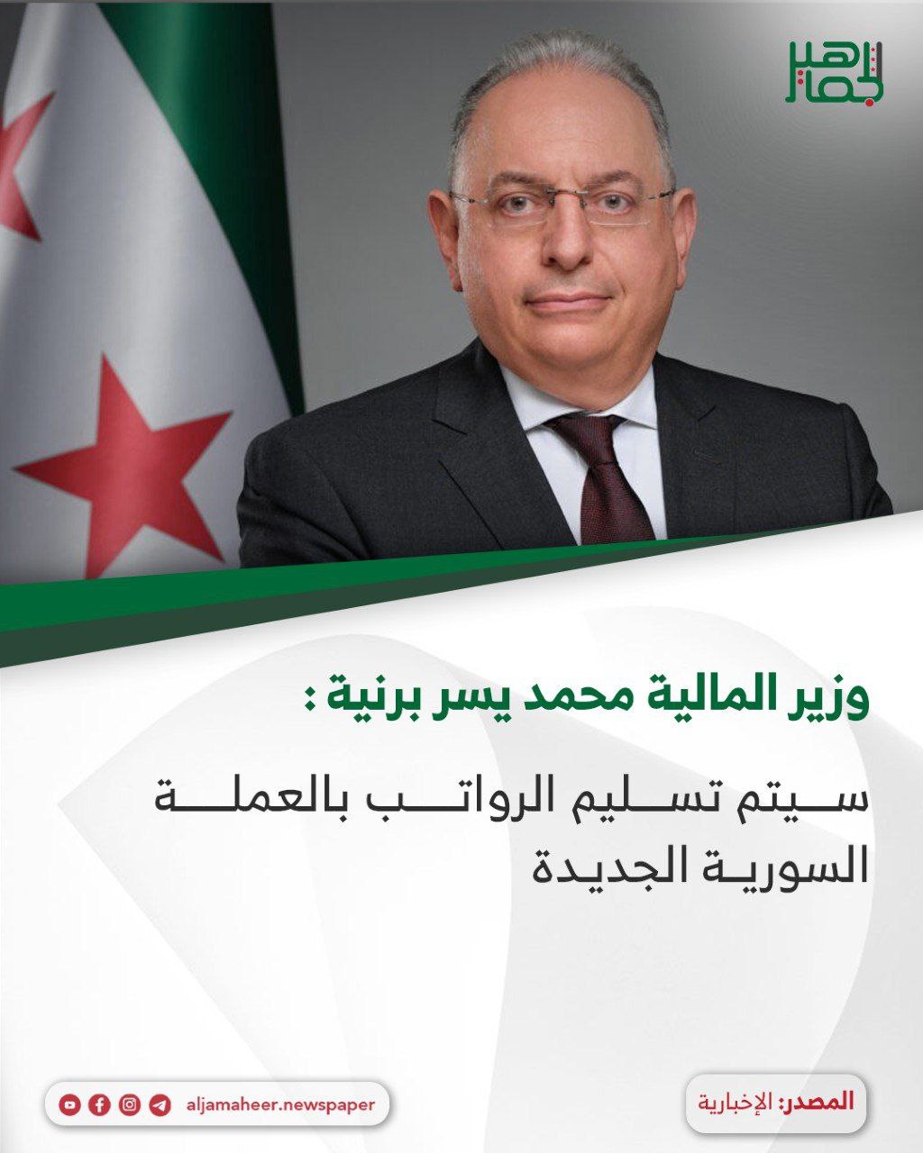 وزير المالية محمد يسر برنية للإخبارية: سيتم تسليم الرواتب بالعملة السورية الجديدة أحدث الأخبار On ديسمبر 29, 2025 Share Share FacebookTwitterGoogle+ReddItWhatsAppPinterestالبريد الإلكتروني