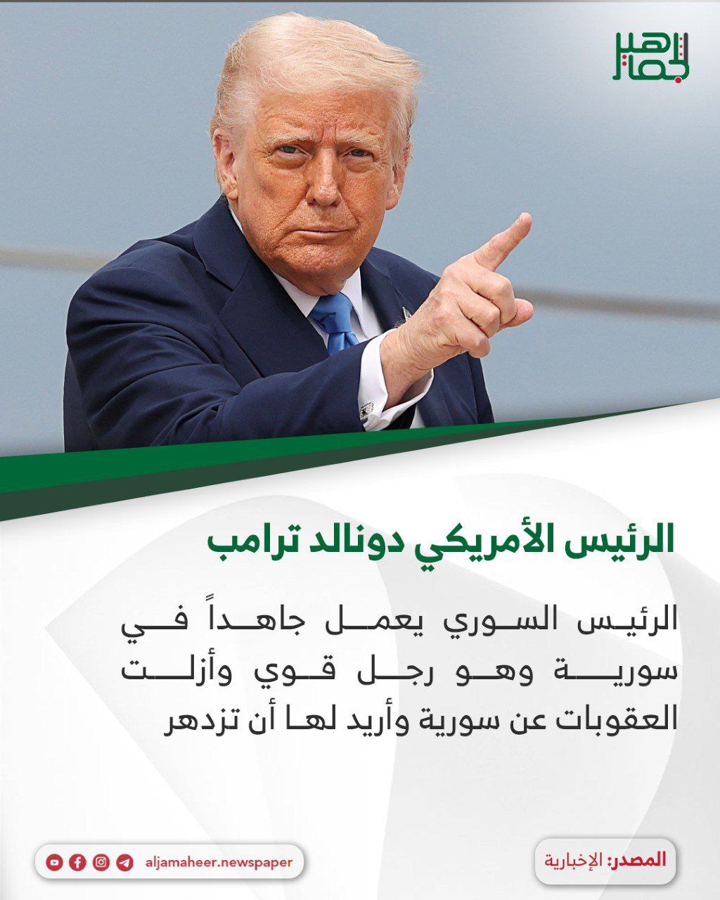 الرئيس الأمريكي دونالد ترامب: سياسة On ديسمبر 29, 2025 Share الرئيس السوري يعمل جاهداً في سورية وهو رجل قوي وأزلت العقوبات عن سورية وأريد لها أن تزدهر الرئيس السوري يقوم بعمل جيد وأتمنى التوصل لاتفاق بين سورية وإســ.ــرائيل اشترك بقناة التيليجرام: https://t.me/jamaheer Share FacebookTwitterGoogle+ReddItWhatsAppPinterestالبريد الإلكتروني