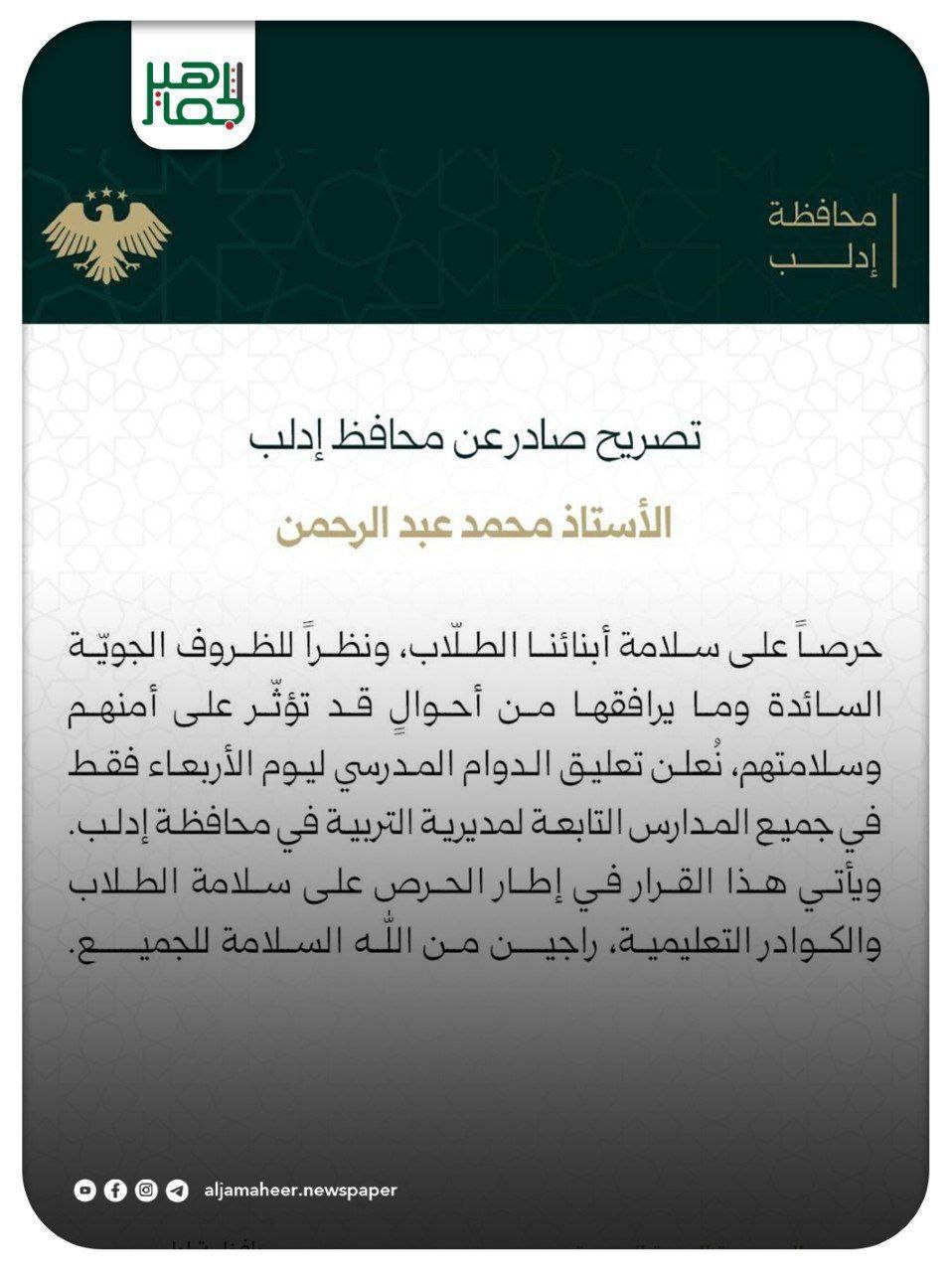 محافظ إدلب محمد عبد الرحمن يعلن تعليق الدوام الرسمي في مدارس محافظة إدلب ليوم الأربعاء نظراً للظروف الجوية السائدة. تعليممحليات On ديسمبر 30, 2025 Share Share FacebookTwitterGoogle+ReddItWhatsAppPinterestالبريد الإلكتروني