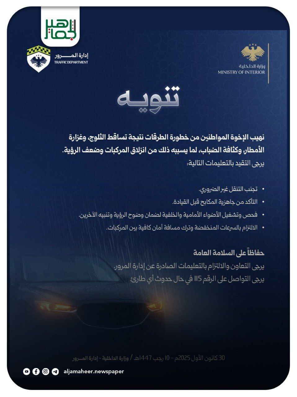 إدارة المرور في وزارة الداخلية: إرشادات هامة أثناء الظروف الجوية القاسية. أحدث الأخبار On ديسمبر 31, 2025 Share تجنب التنقل غير الضروري التأكد من جاهزية المكابح قبل القيادة فحص وتشغيل الأضواء الأمامية والخلفية لضمان وضوح الرؤية الالتزام بالسرعات المنخفضة وترك مسافة أمان كافية بين المركبات اشترك بقناة التيليجرام: https://t.me/jamaheer Share FacebookTwitterGoogle+ReddItWhatsAppPinterestالبريد الإلكتروني