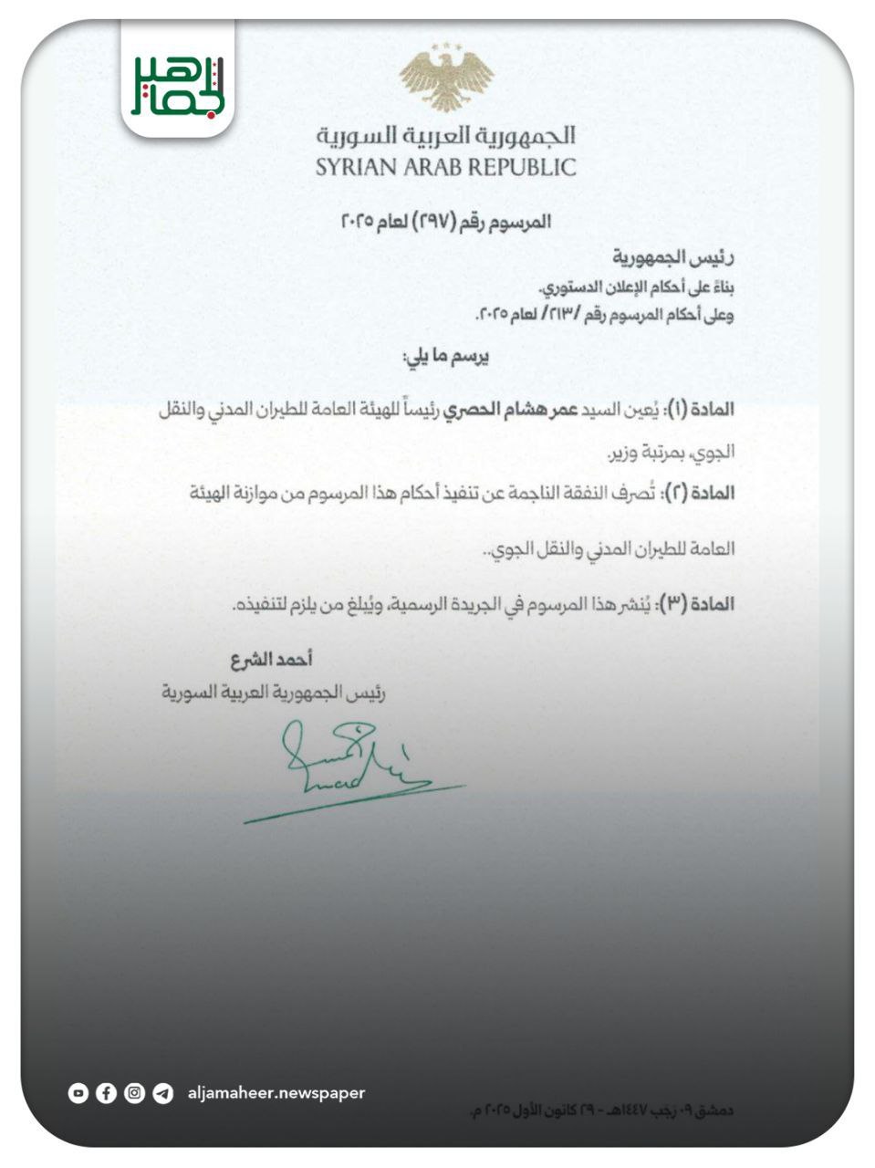 أصدر الرئيس أحمد الشرع المرسوم رقم (297) لعام 2025 القاضي بتعيين عمر هشام الحصري رئيساً للهيئة العامة للطيران المدني والنقل الجوي، بمرتبة وزير محليات On ديسمبر 31, 2025 Share Share FacebookTwitterGoogle+ReddItWhatsAppPinterestالبريد الإلكتروني