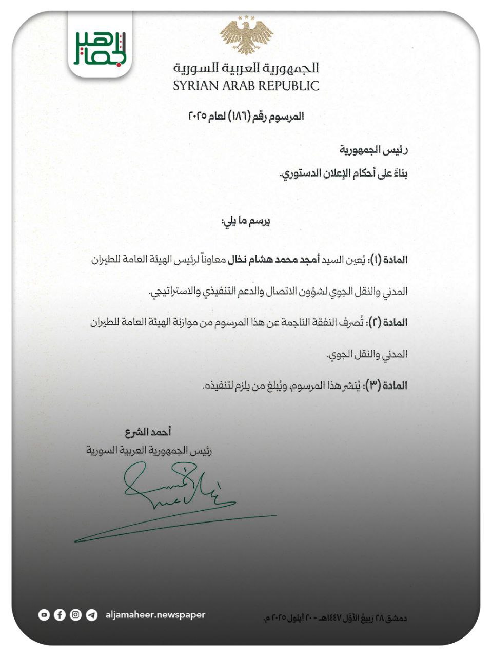الرئيس أحمد الشرع يصدر المرسوم رقم /186/ لعام 2025 القاضي بتعيين السيد أمجد محمد هشام نخّال معاوناً لرئيس الهيئة العامة للطيران المدني والنقل الجوي. أحدث الأخبار On ديسمبر 31, 2025 Share Share FacebookTwitterGoogle+ReddItWhatsAppPinterestالبريد الإلكتروني