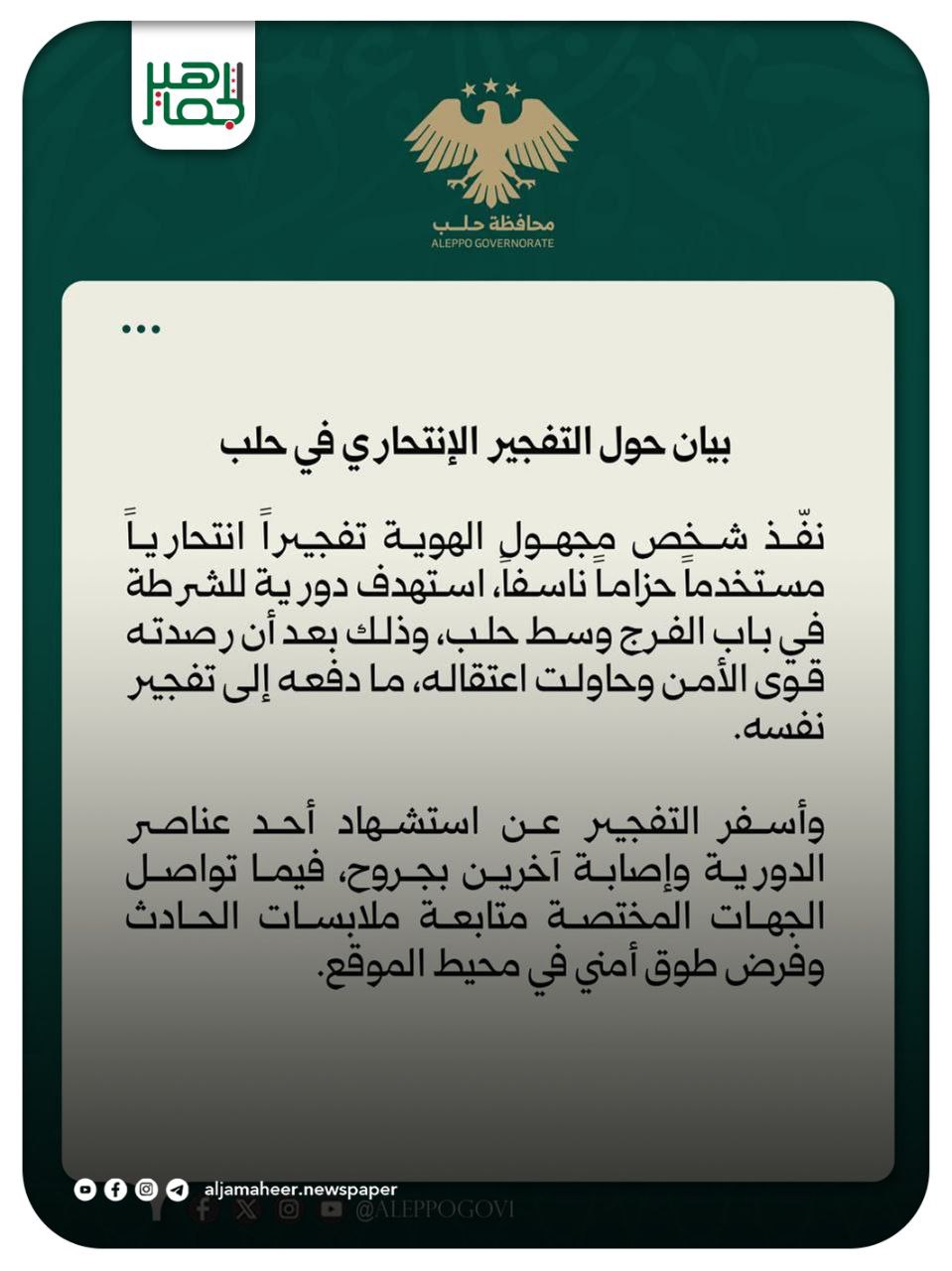 نفّذ شخص مجهول الهوية تفجــ.ــيراً انتــ.ــحارياً مستخدماً حزاماً ناســ.ــفاً، استهدف دورية للشرطة في باب الفرج وسط حلب، وذلك بعد أن رصدته قوى الأمن وحاولت اعتــ.ــقاله، ما دفعه إلى تفجــ.ــير نفسه.