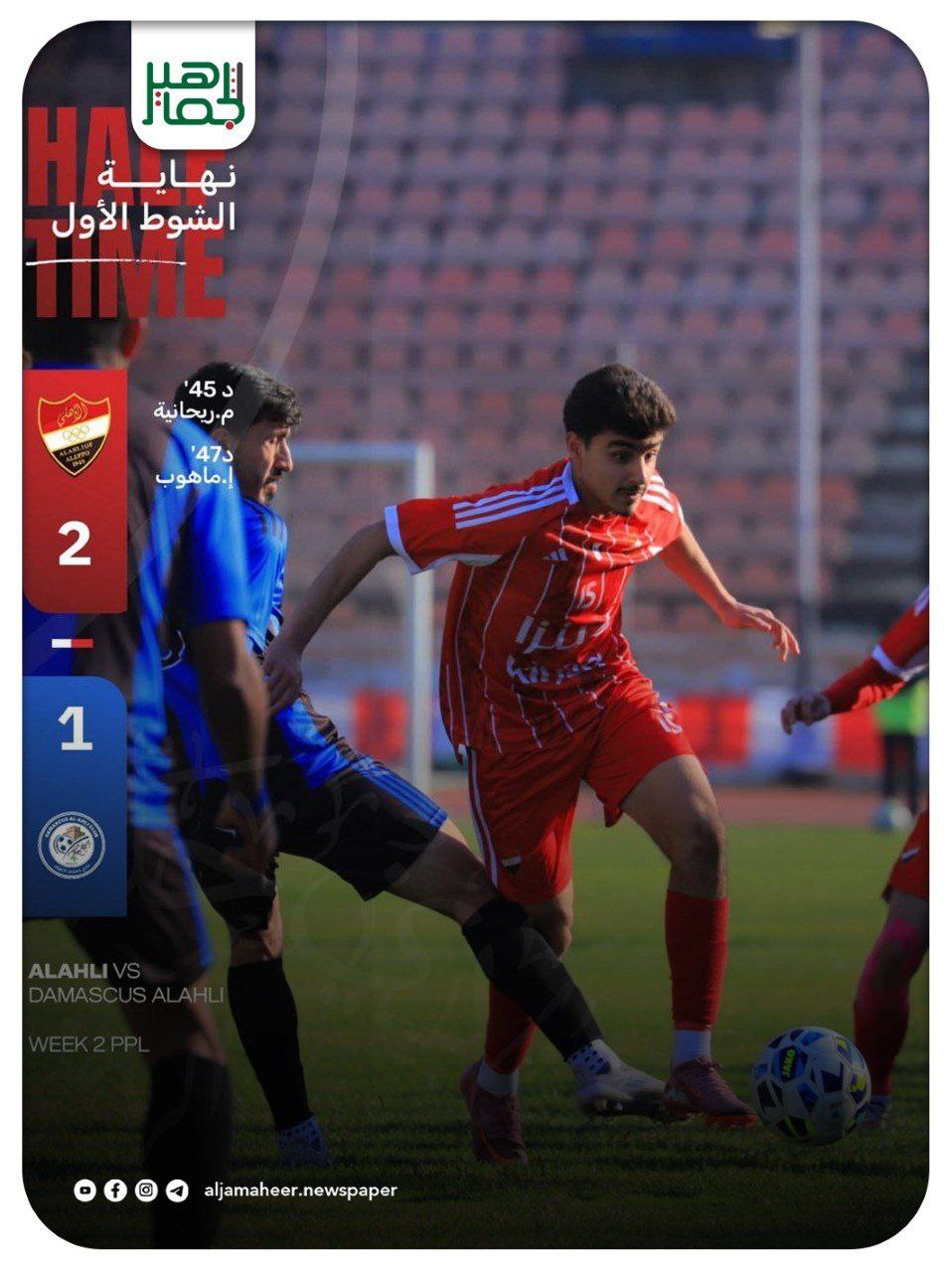 أهلي حلب ينهي الشوط الأول متقدماً على ضيفه أهلي دمشق بنتيجة 2-1 عن طريق محمد ريحانية و ايمانويل ماهوب، ضمن منافسات الجولة الثالثة من الدوري السوري لكرة القدم رياضة On يناير 2, 2026 Share Share FacebookTwitterGoogle+ReddItWhatsAppPinterestالبريد الإلكتروني