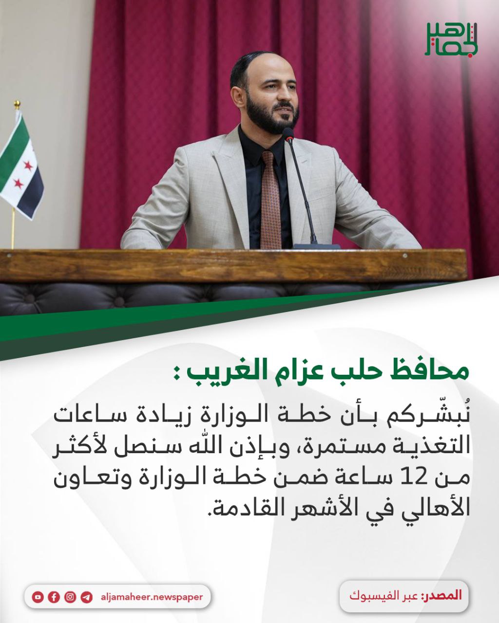 نُبشّركم بأن خطة الوزارة زيادة ساعات التغذية مستمرة، وسنصل لأكثر من 12 ساعة ضمن خطة الوزارة وتعاون الأهالي في الأشهر القادمة.
