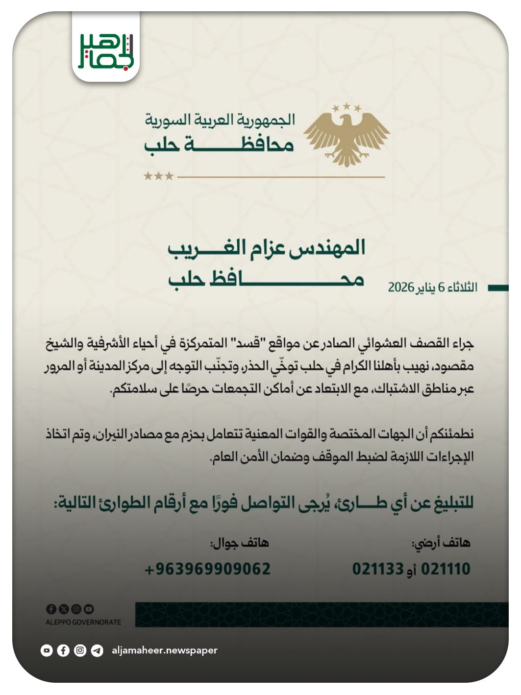 📌جراء القصف العشوائي الصادر عن مواقع “تنظـ ـيم قسـ ـد” المتمركزة في أحياء الأشرفية والشيخ مقصود، نهيب بأهلنا الكرام في حلب توخّي الحذر، وتجنّب التوجه إلى مركز المدينة أو المرور عبر مناطق الاشتباك، مع الابتعاد عن أماكن التجمعات حرصًا على سلامتكم.