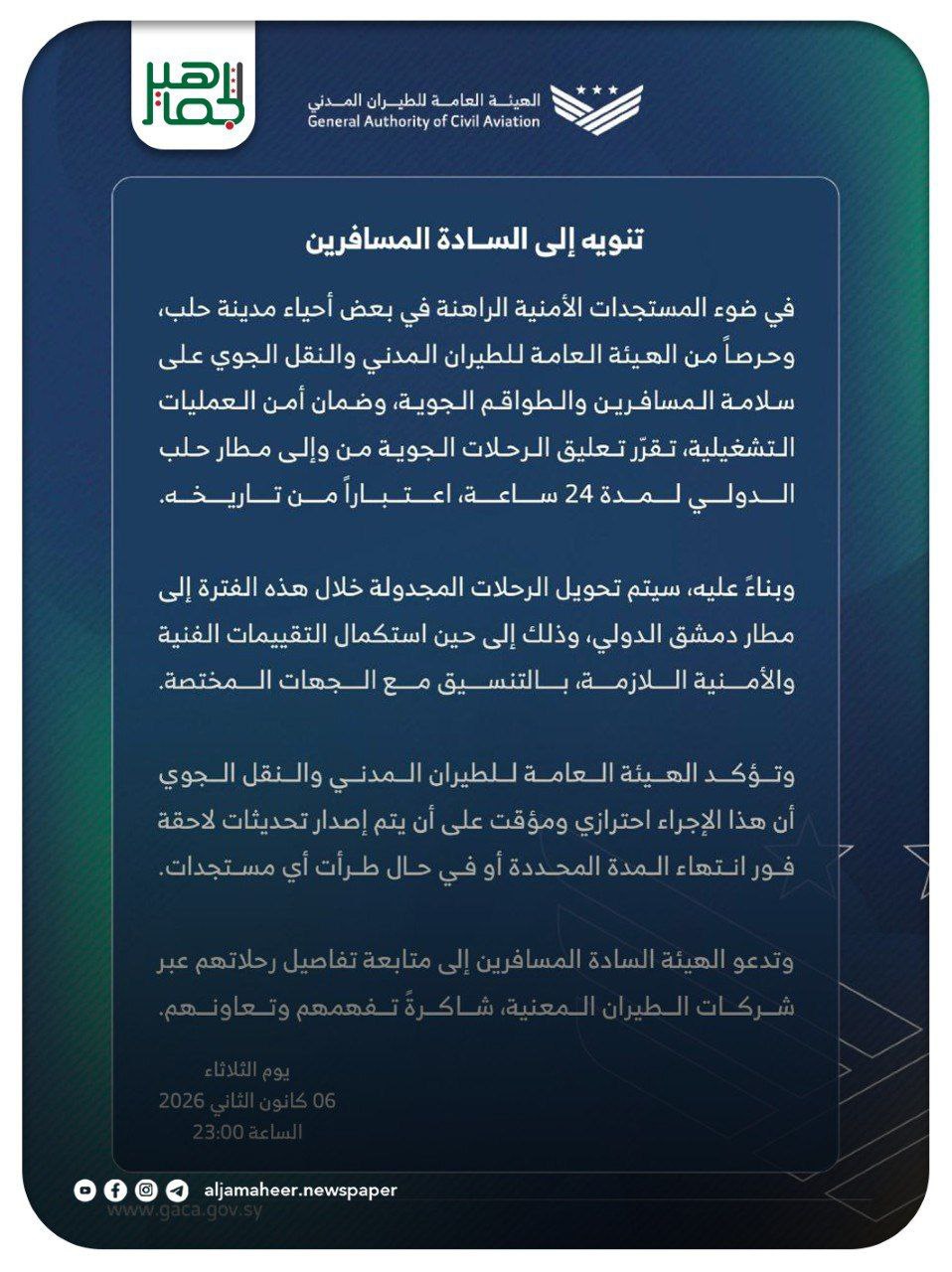 عاجل | الهيئة العامة للطيران المدني والنقل الجوي تعلن تعليق الرحلات الجوية من وإلى مطار حلب لمدة 24 ساعة وتحويلها إلى مطار دمشق، نظراً لاستهداف تنظيم قــ.ــسد الأحياء السكنية في مدينة حلب. أحدث الأخبارالأخبار العاجلة On يناير 7, 2026 Share Share FacebookTwitterGoogle+ReddItWhatsAppPinterestالبريد الإلكتروني