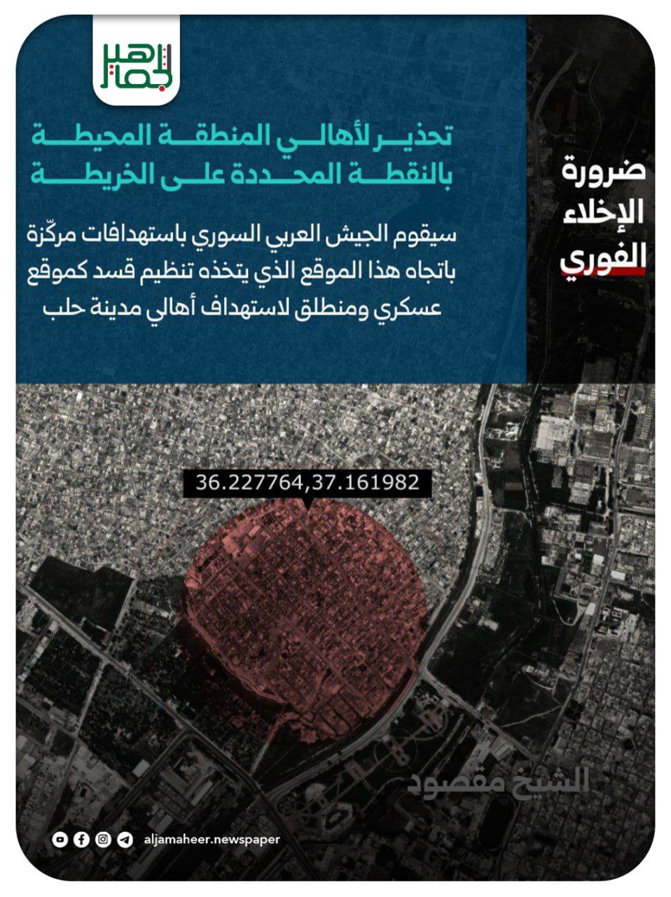 الخريطة التاسعة.. تحذير من الجيش العربي السوري لسكان المنطقة المحددة للاستهداف في حي الشيخ مقصود وضرورة إخلائها فوراً للحفاظ على سلامتهم بسبب اتخاذها من قبل تنظيم قسد كموقع عسكري يقصف منه أحياء وسكان مدينة حلب أحدث الأخبار On يناير 8, 2026 Share Share FacebookTwitterGoogle+ReddItWhatsAppPinterestالبريد الإلكتروني