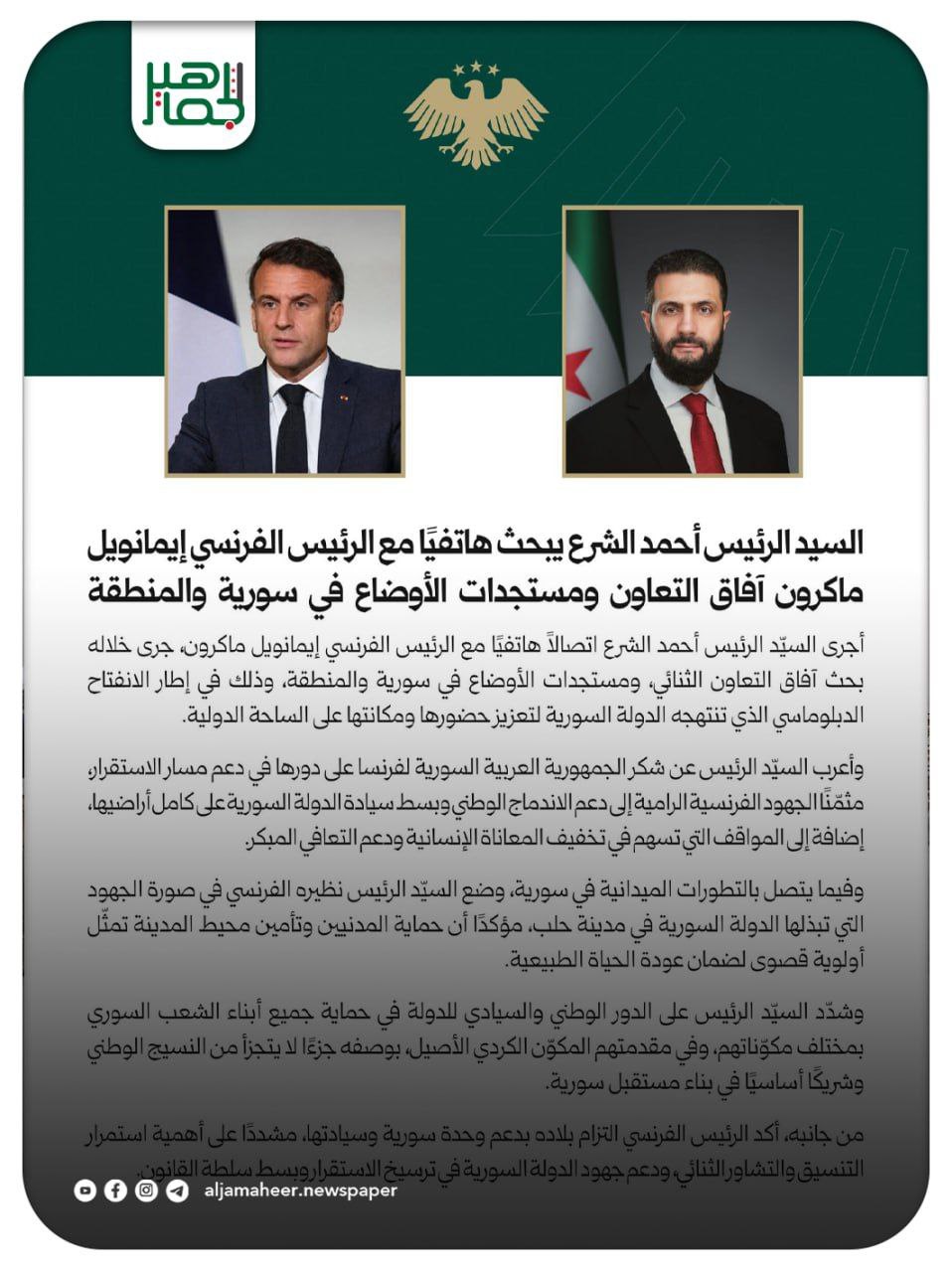 السيد الرئيس أحمد الشرع يبحث هاتفيًا مع الرئيس الفرنسي إيمانويل ماكرون آفاق التعاون ومستجدات الأوضاع في سورية والمنطقة. سياسة On يناير 9, 2026 Share Share FacebookTwitterGoogle+ReddItWhatsAppPinterestالبريد الإلكتروني
