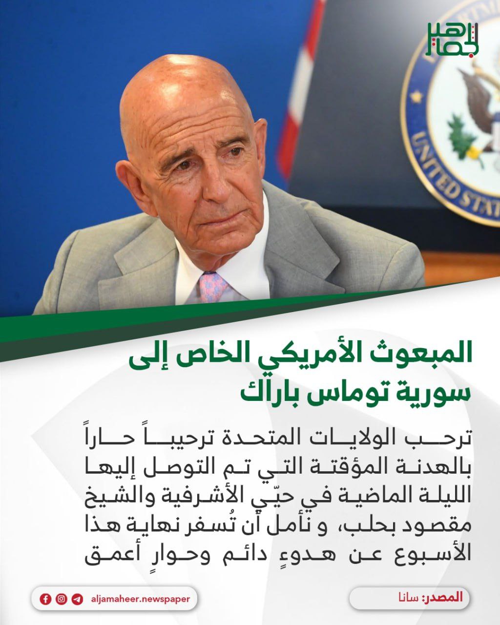 ترحب الولايات المتحدة ترحيباً حاراً بالهدنة المؤقتة التي تم التوصل إليها الليلة الماضية في حيّي الأشرفية والشيخ مقصود بحلب، وتُعرب عن امتنانها العميق لجميع الأطراف، و نأمل أن تُسفر نهاية هذا الأسبوع عن هدوءٍ دائم وحوارٍ أعمق.