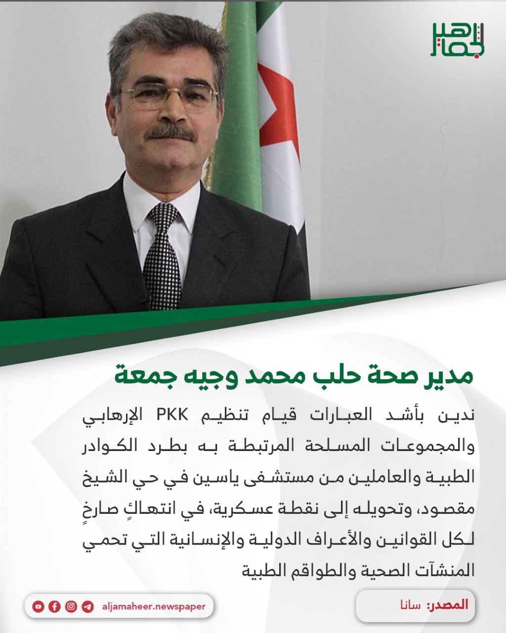 ندين بأشد العبارات قيام تنظيم PKK الإرهـ ـابي والمجموعات المسلحة المرتبطة به بطرد الكوادر الطبية والعاملين من مستشفى ياسين في حي الشيخ مقصود، وتحويله إلى نقطة عسكرية، في انتـ ـهاكٍ صارخٍ لكل القوانين والأعراف الدولية والإنسانية التي تحمي المنشآت الصحية والطواقم الطبية.