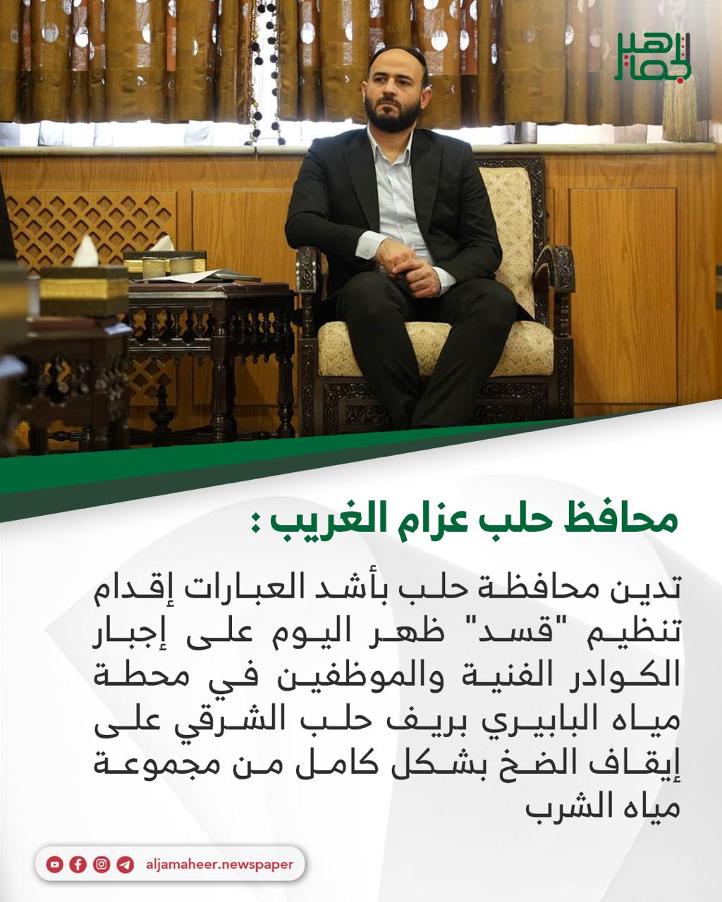 تدين محافظة حلب بأشد العبارات إقدام تنظيم “قسد” ظهر اليوم على إجبار الكوادر الفنية والموظفين في محطة مياه البابيري بريف حلب الشرقي على إيقاف الضخ بشكل كامل من مجموعة مياه الشرب.