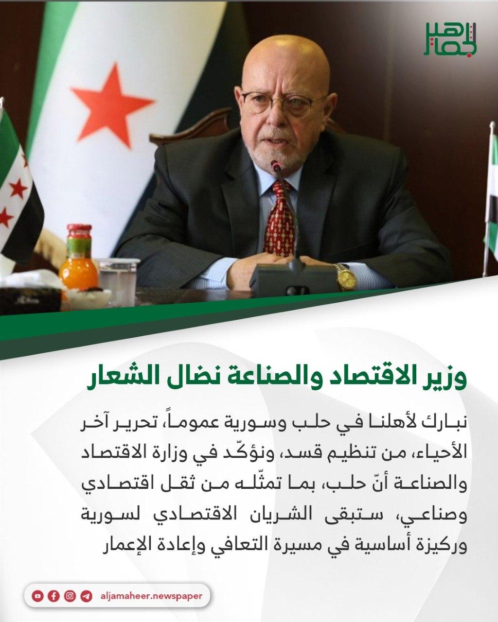 نبارك لأهلنا في حلب وسورية عموماً، تحرير آخر الأحياء، من تنظيم قسد، ونؤكّد في وزارة الاقتصاد والصناعة أنّ حلب، بما تمثّله من ثقل اقتصادي وصناعي، ستبقى الشريان الاقتصادي لسورية وركيزة أساسية في مسيرة التعافي وإعادة الإعمار.