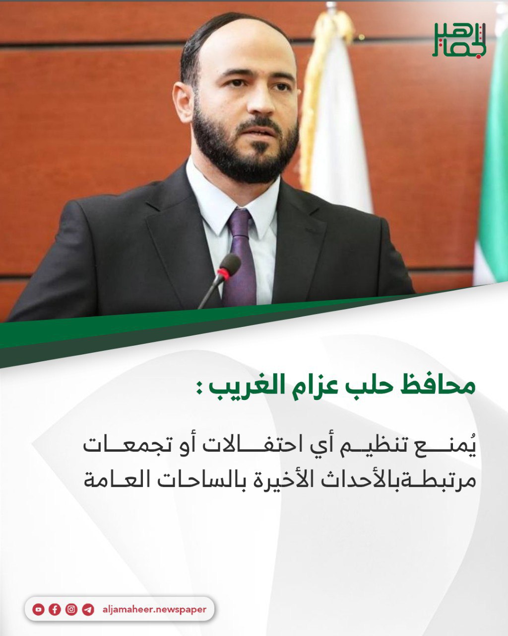 محافظ حلب عزام الغريب يصدر تعميماً لأهالي مدينة حلب في ظل عودة الاستقرار الأمني وحرصاً على السلامة العامة في هذه المرحلة وأكد فيه على ما يلي