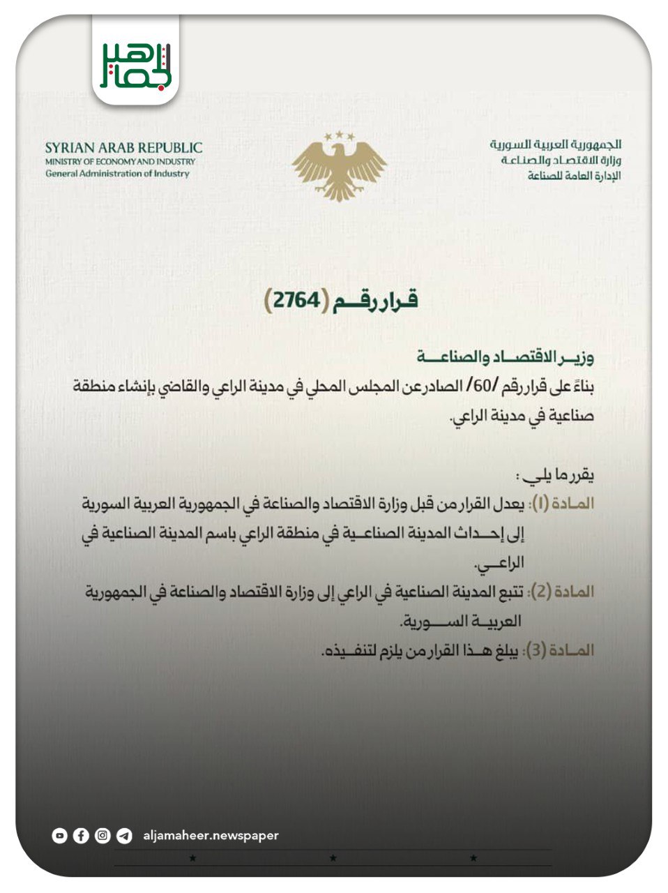 وزارة الاقتصاد: بناءً على قرار وزارة الاقتصاد والصناعة الصادر عن المجلس المحلي في مدينة الراعي، والقاضي بإنشاء “منطقة صناعية” في مدينة الراعي، يعدل هذا القرار ليصبح إحداث “مدينة صناعية” في منطقة الراعي تحت مسمى: المدينة الصناعية في الراعي اقتصاد On يناير 12, 2026 Share Share FacebookTwitterGoogle+ReddItWhatsAppPinterestالبريد الإلكتروني