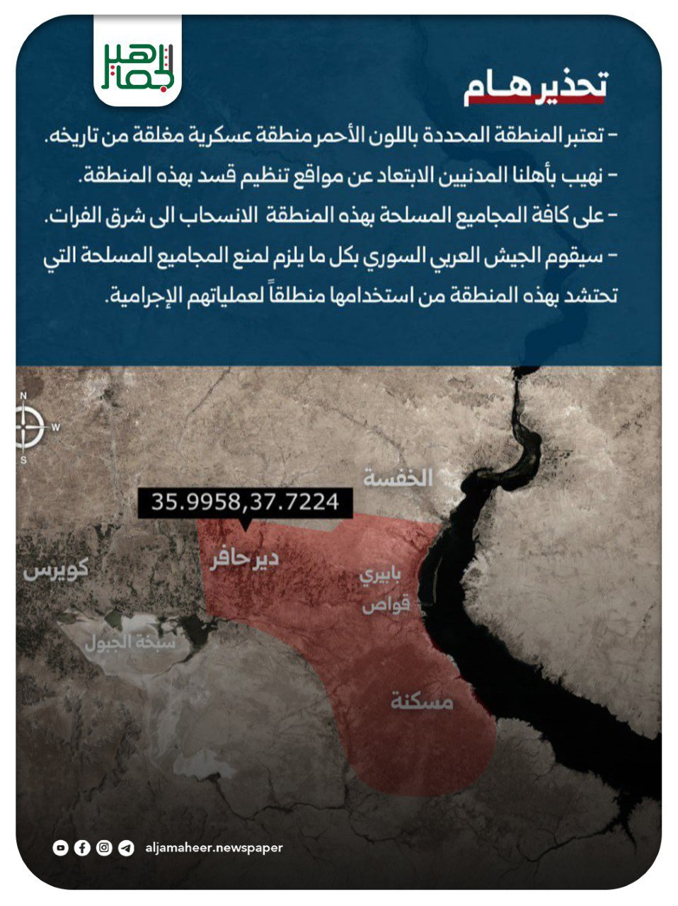 على كافة المجاميع المسـ ـلحة بهذه المنطقة الانسحاب إلى شرق الفرات.. حافظوا على أرواحكم.