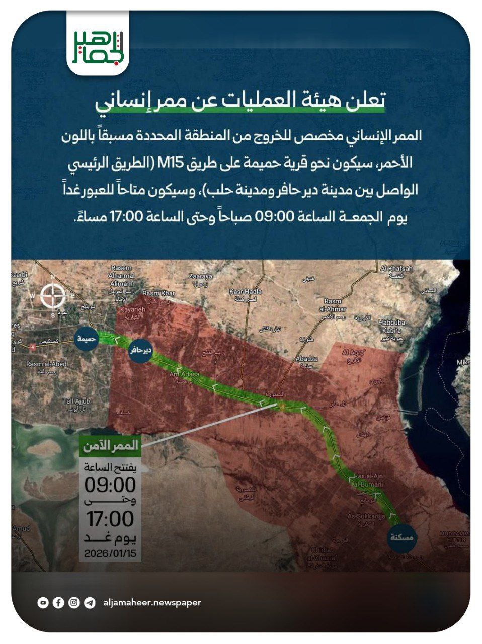 هيئة العمليات في الجيش العربي السوري: تمديد مدة الممر الإنساني في دير حافر ليوم آخر بنفس التوقيت يوم الجمعة من الساعة 09:00 صباحاً وحتى الساعة 17:00 مساءً أحدث الأخبار On يناير 15, 2026 Share Share FacebookTwitterGoogle+ReddItWhatsAppPinterestالبريد الإلكتروني