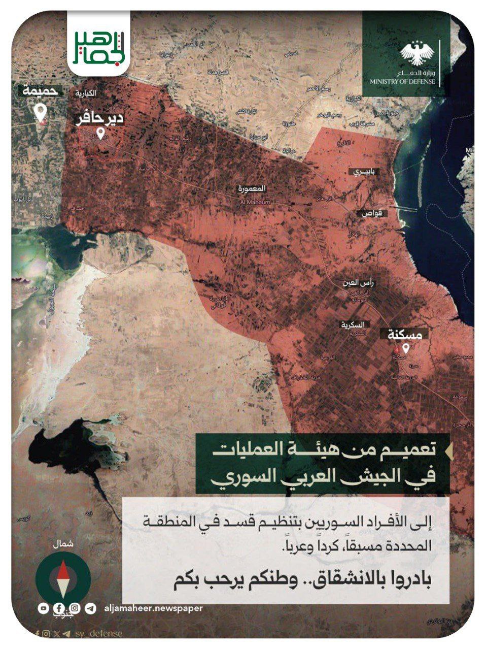 📌إلى الأفراد السوريين بتنظيم قسد كرداً وعرباً، نعلن عن فتح باب الانشقاق وترك هذا التنظيم، وذلك من خلال التوجه إلى أقرب نقطة للجيش العربي السوري.