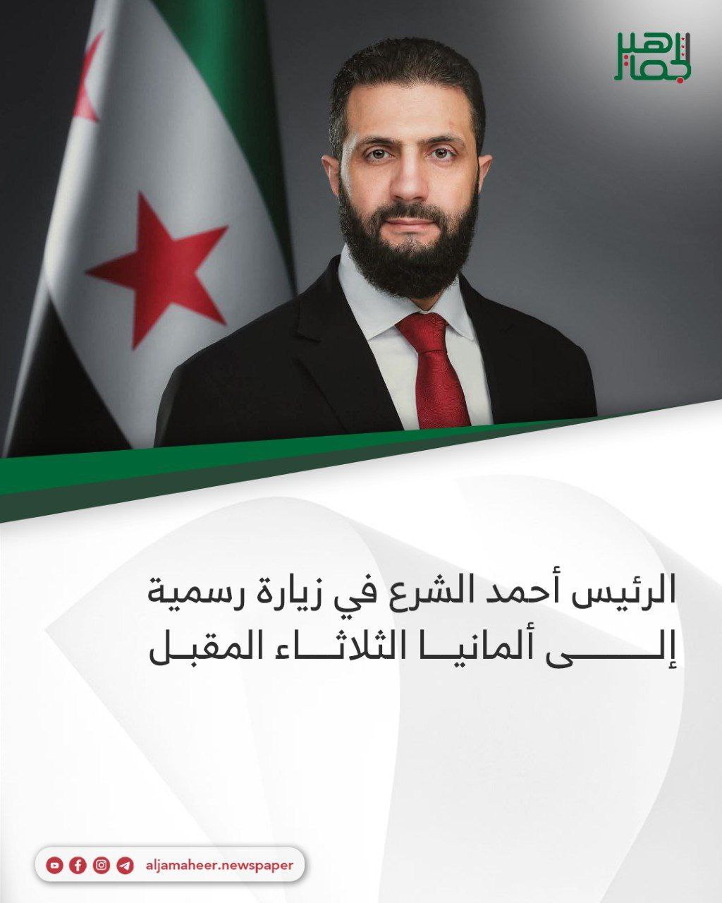 ذكرت مديرية الإعلام في رئاسة الجمهورية لـ سانا: أن الرئيس الشرع سيلتقي الرئيس الاتحادي الألماني فرانك فالتر شتاينماير في قصر بلفيو بالعاصمة برلين، يوم الثلاثاء المقبل لإجراء محادثات رسمية وبحث سبل تطوير العلاقات بين البلدين.