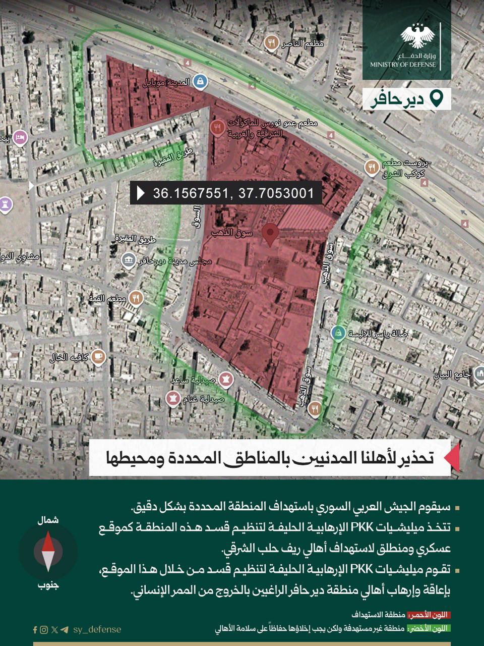 هيئة العمليات في الجيش العربي السوري تنشر خريطة الموقع رقم 3 في دير حافر مع تحذير للأهالي بيانه: نهيب بأهلنا المدنيين الابتعاد عن هذا الموقع الذي تتخذه ميليشيات PKK الإرهابية وفلول النظام البائد حلفاء تنظيم قسد، منطلقاً لعملياتها الارهابية تجاه مدينة حلب وريفها الشرقي وقواعد اطلاق للمسيرات.