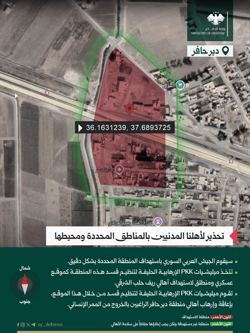 هيئة العمليات في الجيش العربي السوري تنشر خريطة الموقع رقم 4 في دير حافر مع تحذير للأهالي بيانه: نهيب بأهلنا المدنيين الابتعاد عن هذا الموقع الذي تتخذه ميليشيات PKK الإرهابية وفلول النظام البائد حلفاء تنظيم قسد، منطلقاً لعملياتها الارهابية تجاه مدينة حلب وريفها الشرقي وقواعد اطلاق للمسيرات.