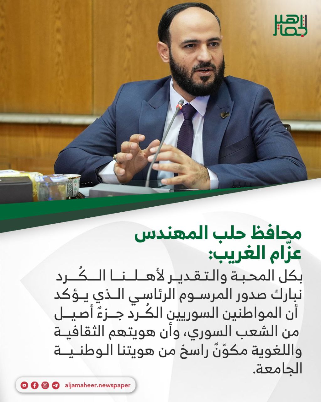 نبارك صدور المرسوم الرئاسي الذي يؤكد أن المواطنين السوريين الكُرد جزءٌ أصيل من الشعب السوري، وأن هويتهم الثقافية واللغوية مكوّنٌ راسخ من هويتنا الوطنية الجامعة.