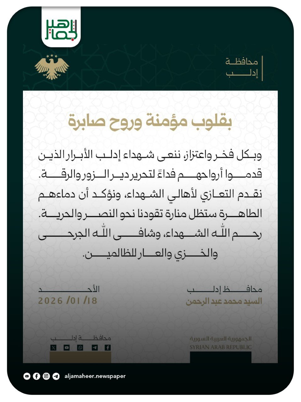 تعزية من محمد عبد الرحمن محافظ إدلب بشهداء محافظة إدلب الذين ارتقوا في معارك تحرير الرقة ودير الزور. أحدث الأخبار On يناير 19, 2026 Share Share FacebookTwitterGoogle+ReddItWhatsAppPinterestالبريد الإلكتروني