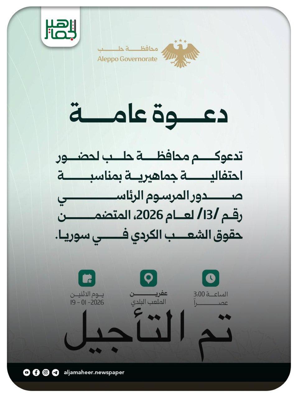 أما فيما يخص الفعالية التي أعلن عنها اليوم في عفرين، لم تكن الفعالية بحد ذاتها من صلب الاهتمام بسبب تزاحم وتسارع الأحداث. وكما تعلمون، فلقد عممنا سابقاً لمنع الاحتفالات عقب انتهاء عمليات الشيخ مقصود والأشرفية، فلقد تم تنسيقها من قِبل المعنيين بالفعاليات بعد صدور المرسوم الرئاسي 13 الذي سيعيد لأهلنا الكورد حقوقهم المسلوبة.