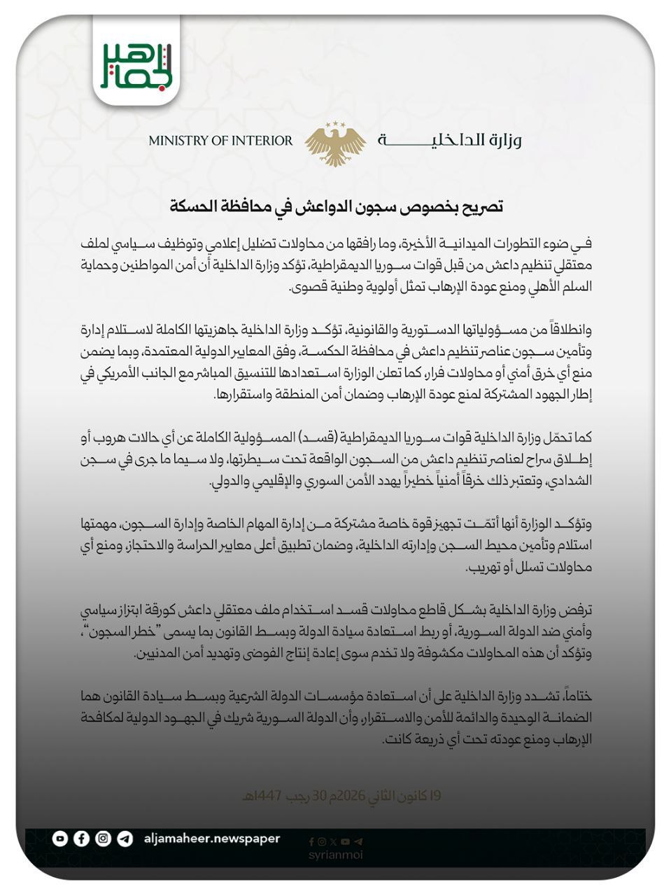 في ضوء التطورات الميدانية الأخيرة، وما رافقها من محاولات تضليل إعلامي وتوظيف سياسي لملف معتقلي تنظيم داعــ.ــش من قبل قســ.ــد، نؤكد أن أمن المواطنين وحماية السلم الأهلي ومنع عودة الإرهــ.ــاب تمثل أولوية وطنية قصوى.