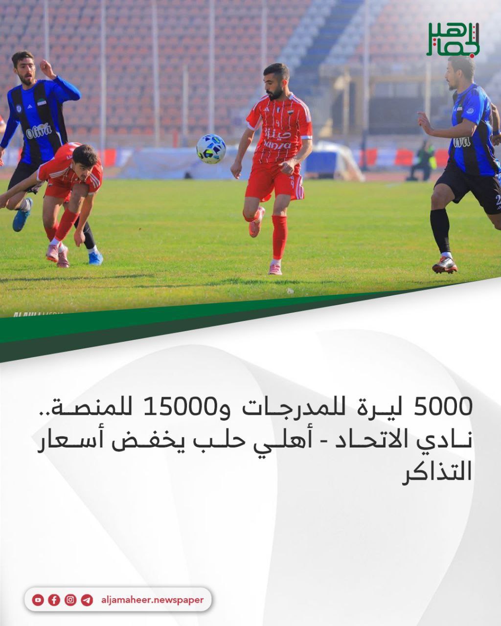 قرر مجلس إدارة نادي الاتحاد – أهلي حلب تخفيض أسعار تذاكر مباريات الفريق الأول لكرة القدم في مدينة حلب، اعتباراً من اللقاءات المقبلة.