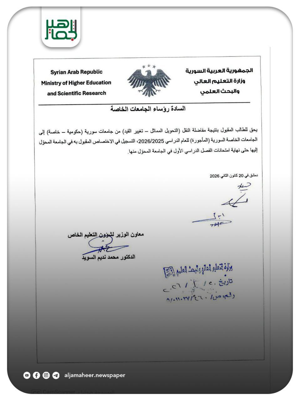 وزارة التعليم العالي: يحق للطالب المقبول بنتيجة مفاضلة النقل التحويل المماثل- تغيير ( القيد من جامعات سورية ( حكومية – خاصة) إلى الجامعات الخاصة السورية ( المأجورة) للعام الدراسي 2026/2025 ، التسجيل في الاختصاص المقبول به في الجامعة المحوّل إليها حتى نهاية امتحانات الفصل الدراسي الأول في الجامعة المحوّل منها