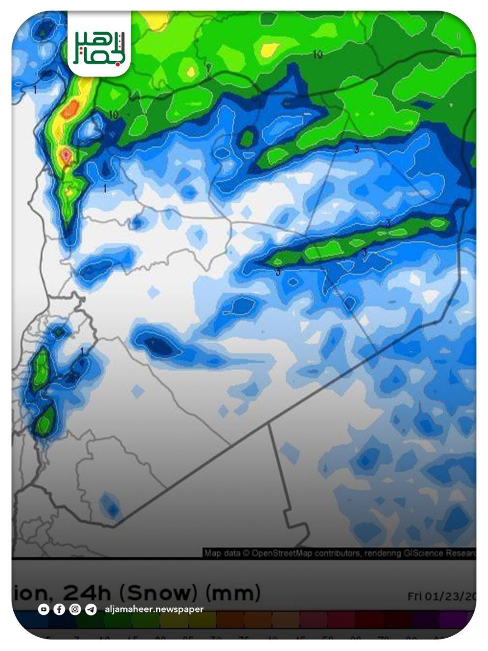 هطولات ثلجية مع بعض التركمات دون 5 سم في بقية مناطق جنوب حلب وإدلب.