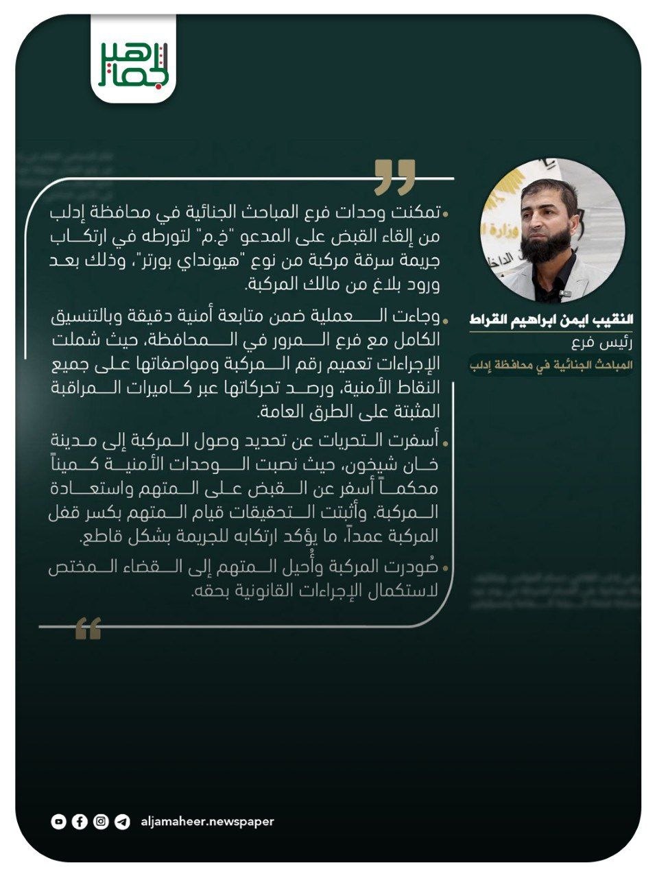تصريح رئيس فرع المباحث الجنائية في محافظة إدلب، النقيب أيمن القراط، حول إلقاء القبض على أحد سارقي السيارات محليات On يناير 22, 2026 Share Share FacebookTwitterGoogle+ReddItWhatsAppPinterestالبريد الإلكتروني