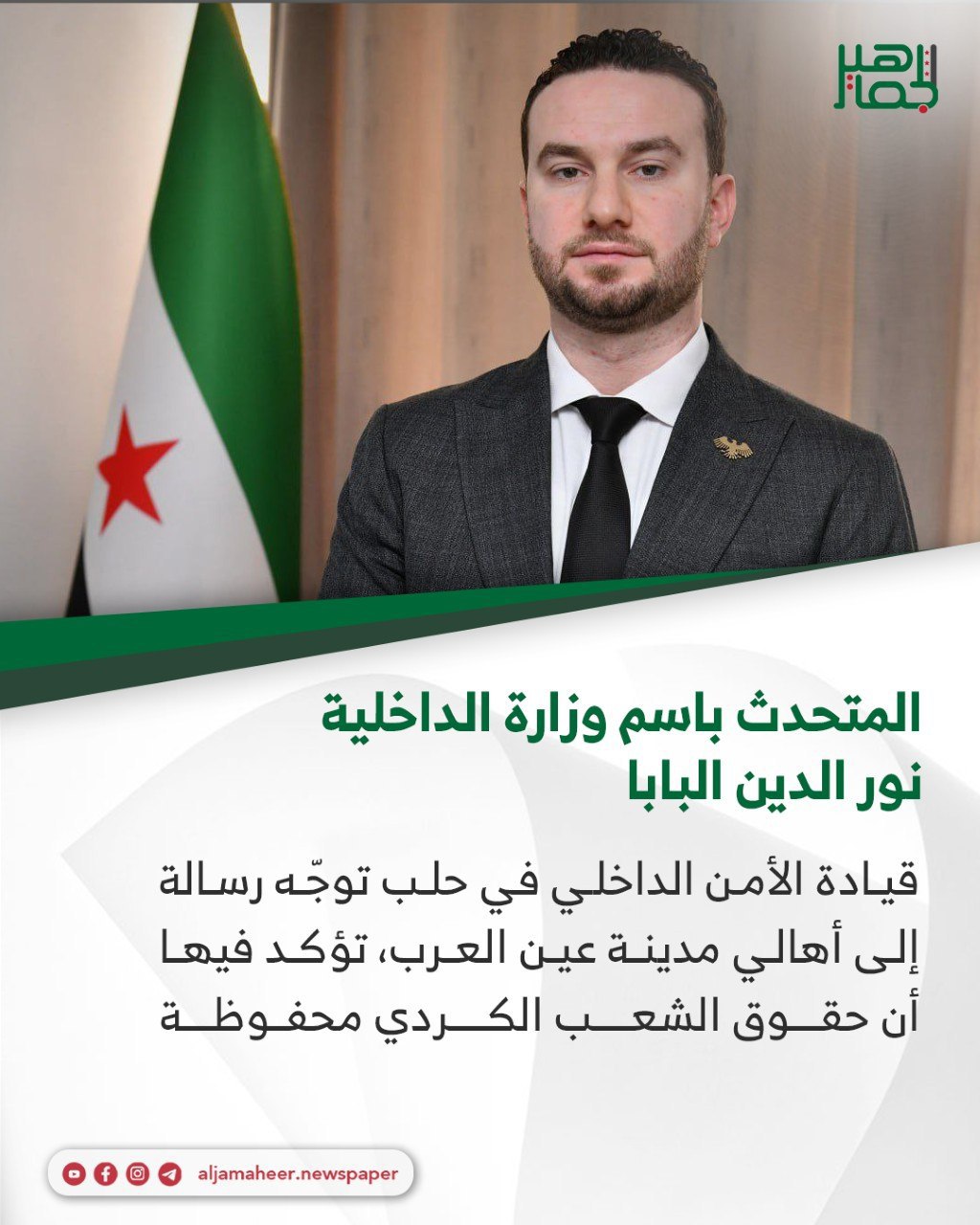 المتحدث باسم وزارة الداخلية نور الدين البابا أحدث الأخبار On يناير 23, 2026 Share قيادة الأمن الداخلي في حلب توجّه رسالة إلى أهالي مدينة عين العرب، تؤكد فيها أن حقوق الشعب الكردي محفوظة، وأن الوحدة بين المكونات السورية، وعلى رأسها العرب والكرد، تشكّل أساس بناء مدينة آمنة ومستقرة. 🔔 اشترك بقناة التيليجرام: https://t.me/jamaheer Share FacebookTwitterGoogle+ReddItWhatsAppPinterestالبريد الإلكتروني